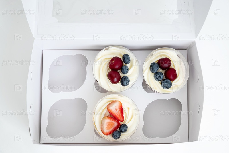 Вид сверху на полупустую коробку тортов со сливками и свежими ягодами