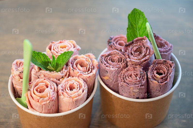 Дуэт мороженого, украшенного листиком свежей мяты в бумажных стаканчиках