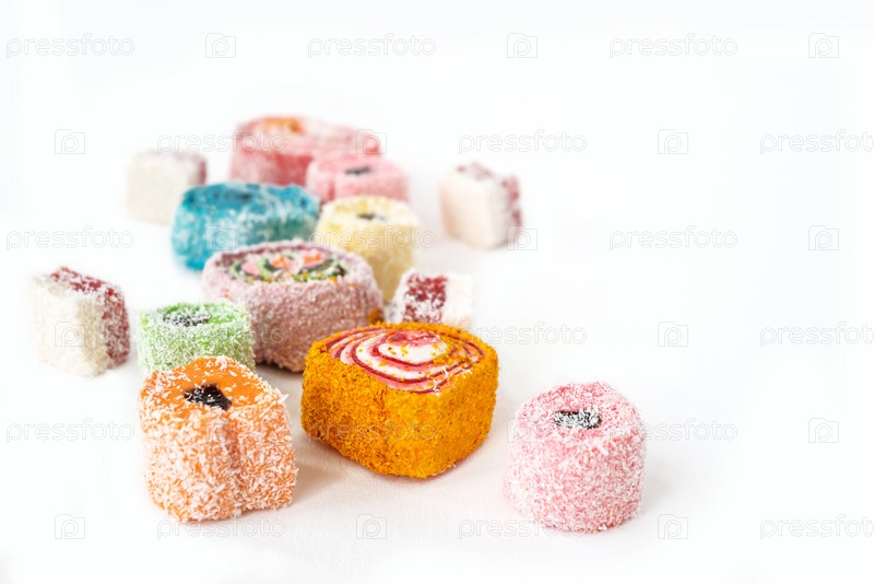 Разноцветные желейные конфеты разной формы разбросаны по белой поверхности