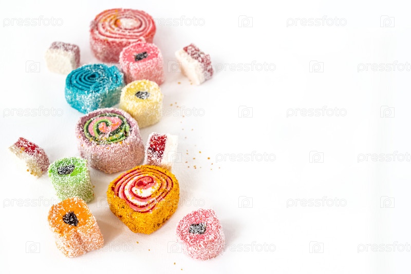 Разноцветные желейные конфеты разной формы разбросаны по белому фону