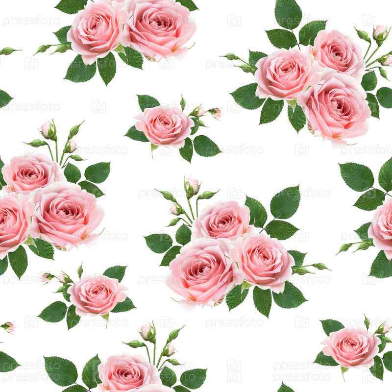 Цветочный бесшовный узор с розовыми розами и листьями для обоев, обертывания бумаги, ткани и т.д. Белый фон