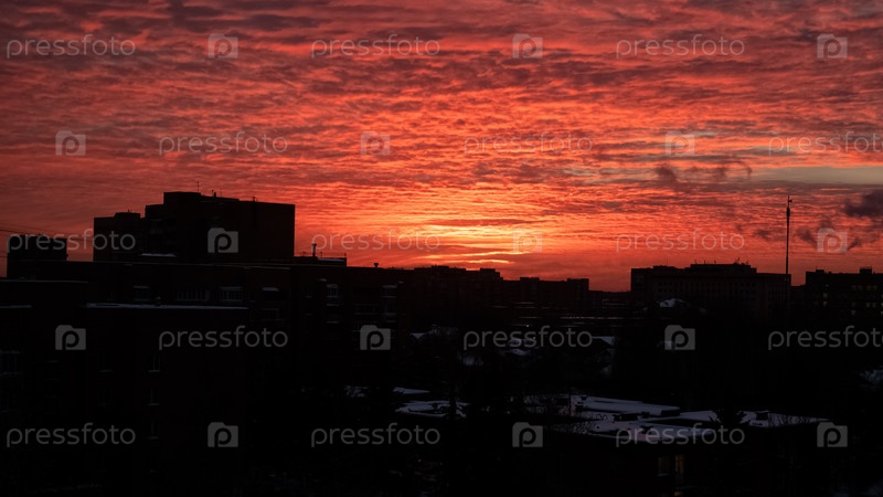 Силуэт жилого района под горящим небом на рассвете ранним зимним утром