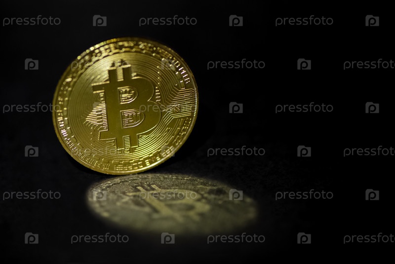 Золотой биткойн отражает свет на темной поверхности