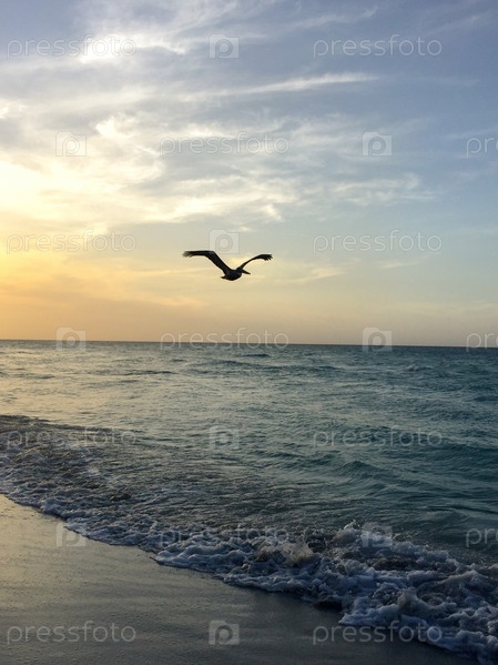 Пеликан летит над песчаным пляжем в сумерках на закате