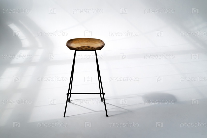 Деревянный стул, стоящий в средней комнате с жесткими тенями оконной рамы на белом полу