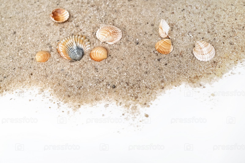 Ребристые морские раковины разбросаны по поверхности песка с копией пространства