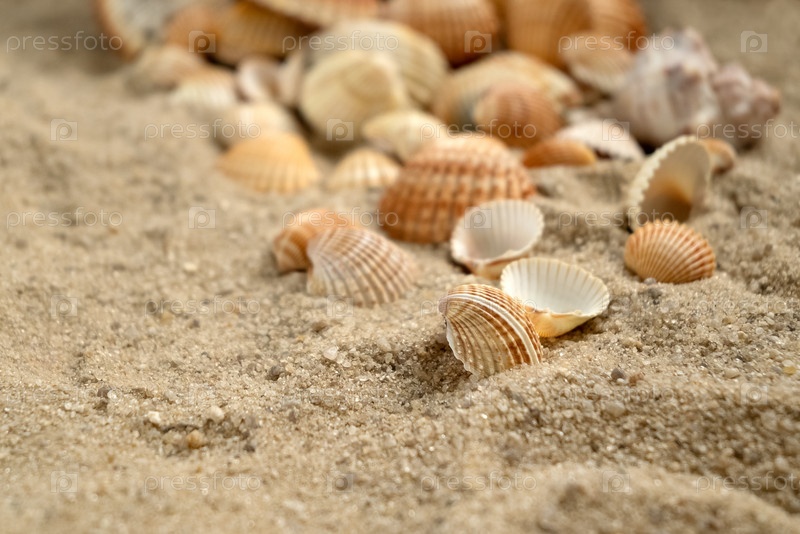 Раковины морских гребешков, разбросанные по песчаному пляжу, фон морского отдыха