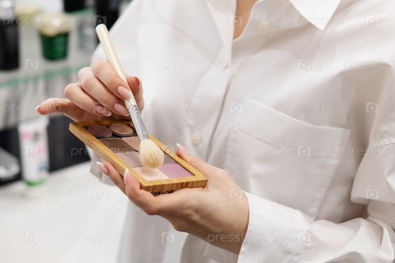 Женщина держит в руках палитру обнаженного макияжа и кисть, готовая нанести макияж