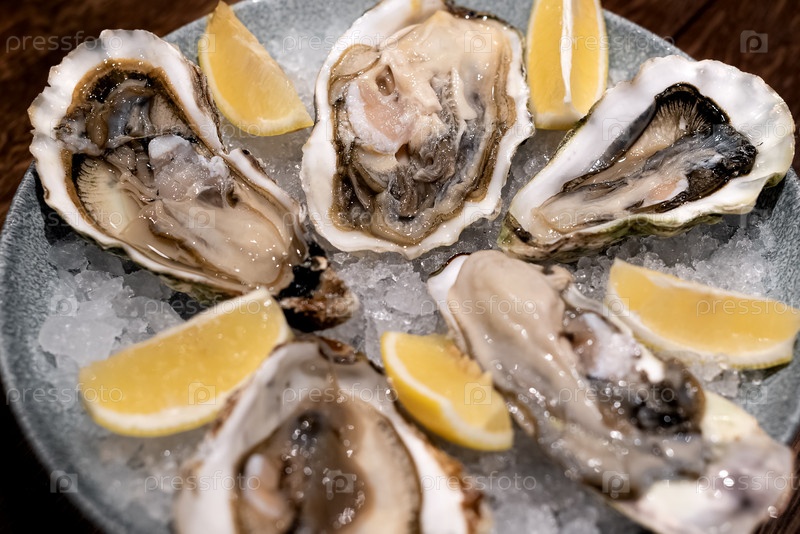 Свежие устрицы в раковинах в тарелке с дробленым льдом и ломтиками лимона