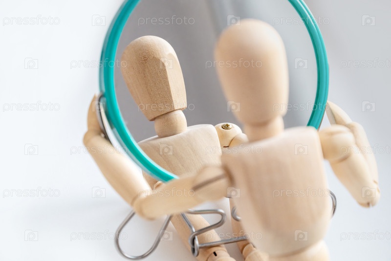 Деревянный манекен смотрит на свое отражение в зеркале
