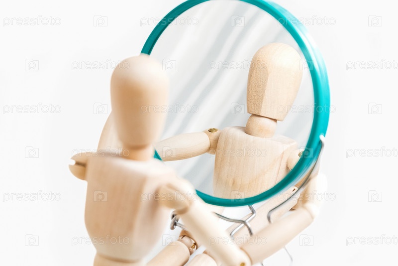 Деревянный манекен смотрит на свое отражение в зеркале