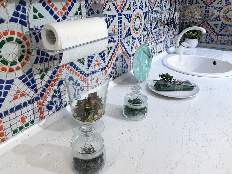 Интерьер кухни с цветной плиткой на стене
