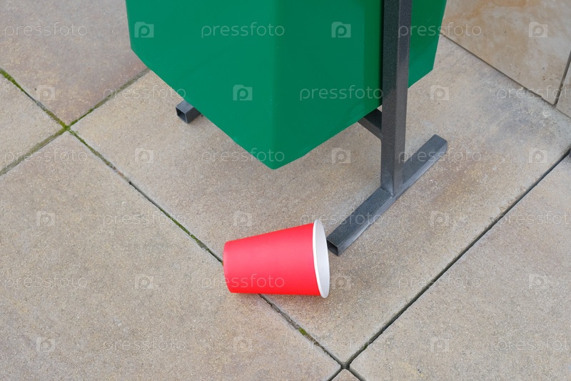 Брошенный бумажный красный стакан на тротуар рядом с зеленой мусорной урной