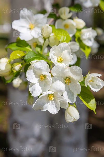 Белые цветущие яблони в лучах солнца. Весенний сезон, весенние краски