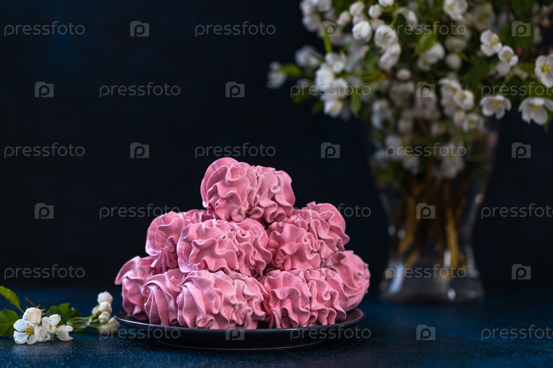 Розовый зефир на тарелке на синем фоне