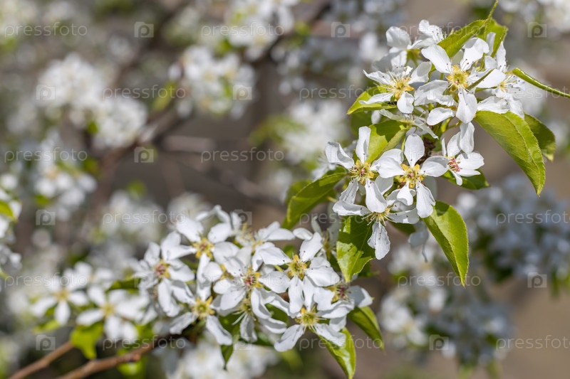 Крупный план белых цветов на грушевом дереве. Красивый фон цветущего сада