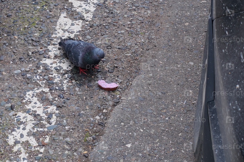 Голодный уличный серый голубь клюет розовый пончик на асфальтовой дороге рядом с колесом автомобиля