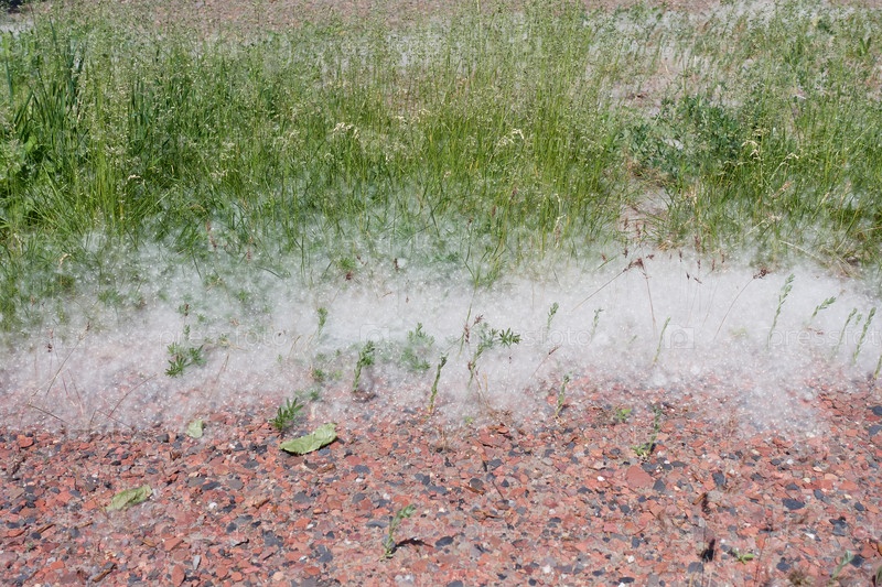Тополиный пух лежит на земле, создавая контраст между красным щебнем и зеленой травой. Вызывает аллергию у человека