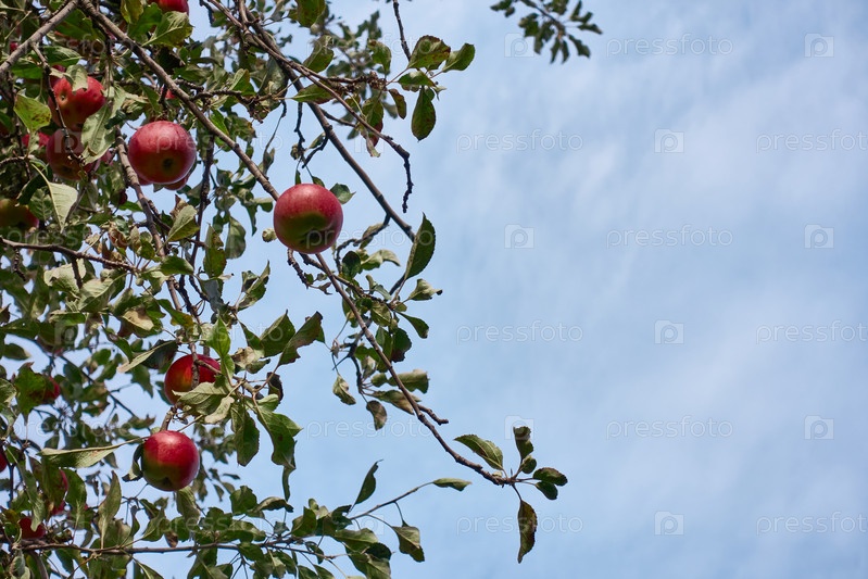 На яблоне в деревенском саду зрели красные яблоки сорта Райка на фоне пасмурного синего неба