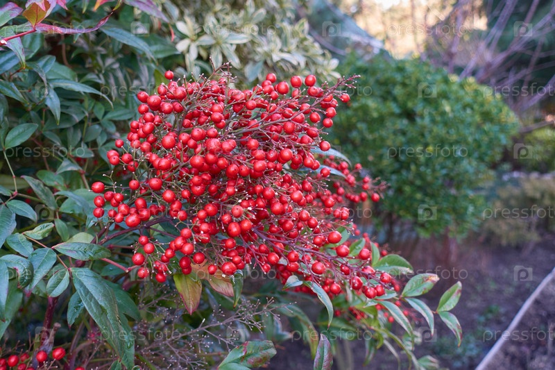 Спелые красные ягоды растения нандина созрели в деревенском саду