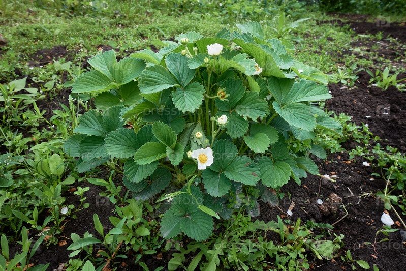 Клубничный куст цветет в деревенском саду. Выращивание ягод для личного пользования