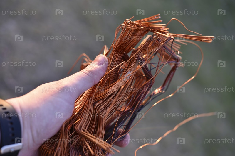 Пучок медной проволоки в руке. Медный лом. Блестящий красный медный провод