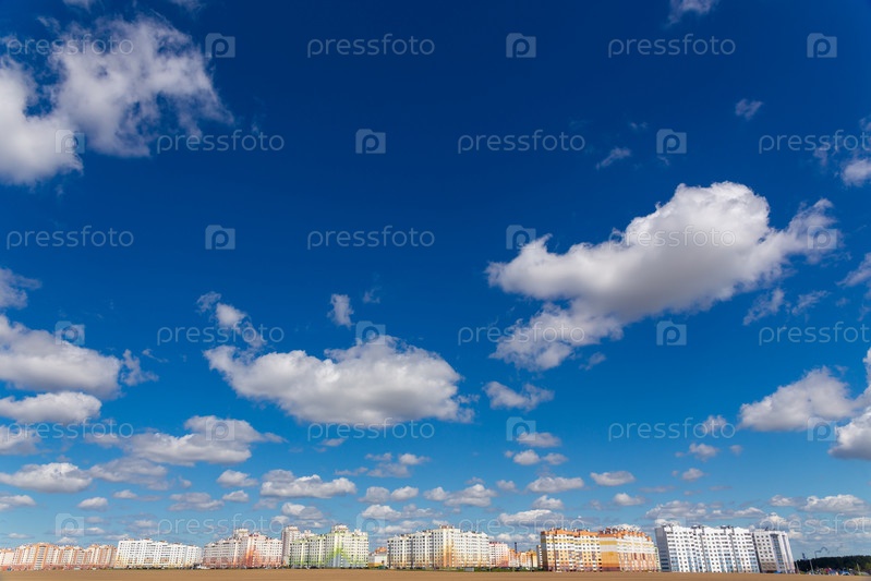 Глубокое синее небо с фоном белых облаков и современный многоэтажный жилой район на горизонте, текстура синего облачного неба, обои темно-синего неба с полностью белыми облаками и солнечным светом