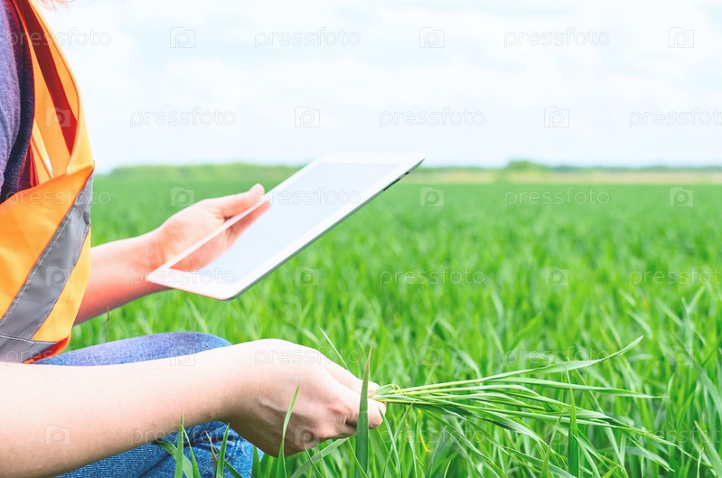 Умное сельское хозяйство, фермер осматривает растения и смотрит на планшетный компьютер