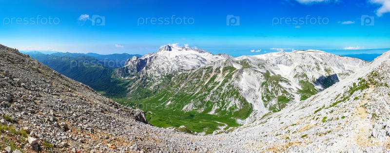 Панорама горного пейзажа. Белые горы с ледниками на фоне зеленых ущелий и голубого неба. Гора Фишт и гора Пшеха-Су на юге России