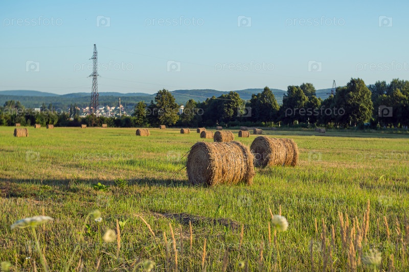 Круглые тюки сена разбросаны по свежескошенному полю с деревьями, горами и голубым небом на заднем плане. Заготовка сена на зиму для кормления скота