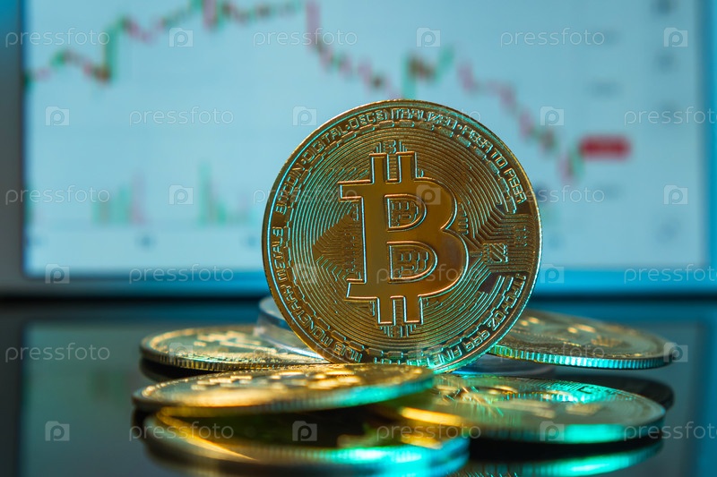 Большой план криптовалютной монеты Биткойн в красивом зеленоватом свете стоит среди горстки разбросанных монет на фоне падающего графика стоимости BTC на бирже