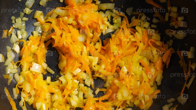Вид сверху в черной сковороде жареные морковь и лук. Кулинария в азиатском стиле