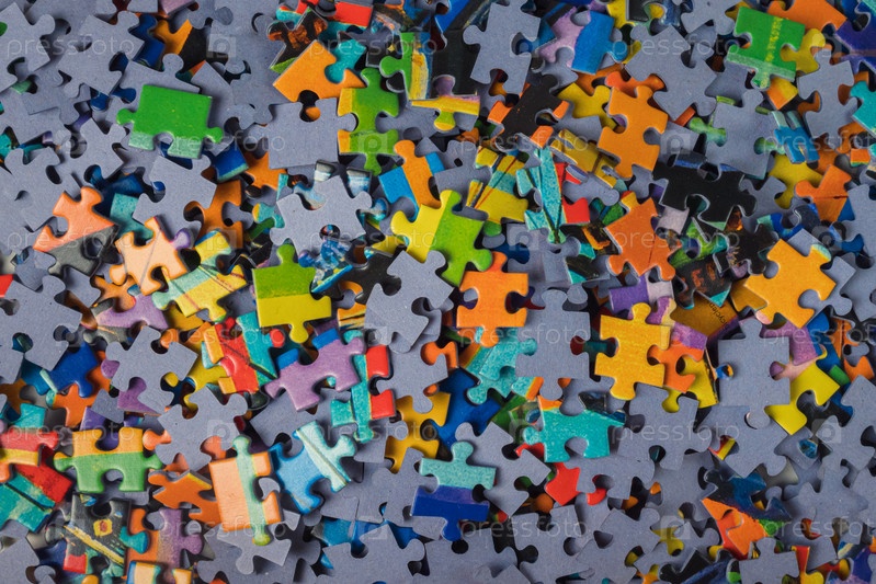 Куча кусочков пазла по всей рамке. Фоновое изображение разбросанных красочных кусочков головоломки
