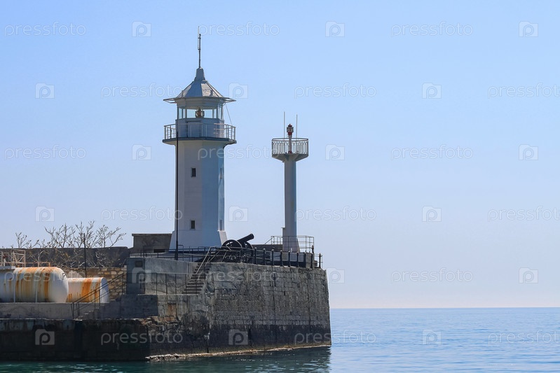 Белая башня небольшого старого маяка на скалистом мысе. На заднем плане спокойное голубое море и небо. Ялта, Крым