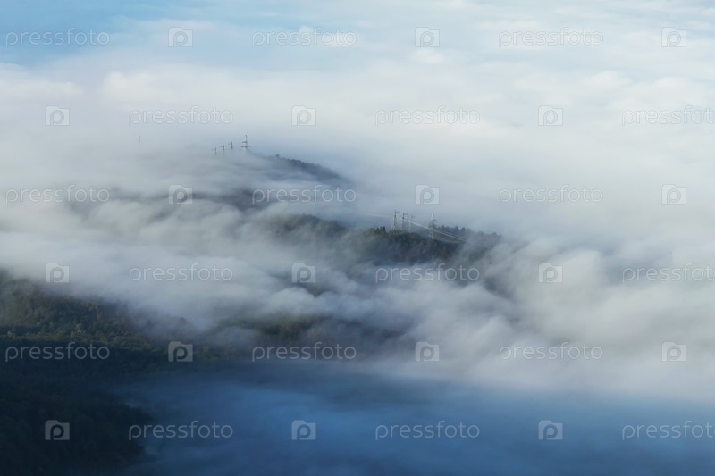 Зеленый лес покрыт густым туманом. Столбы ЛЭП торчат из тумана. Красивый горный пейзаж