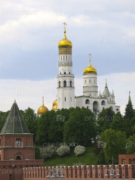 Кремлевская стена из красного кирпича и церковь-колокольня Ивана Великого в составе архитектурного ансамбля Соборной площади Московского Кремля