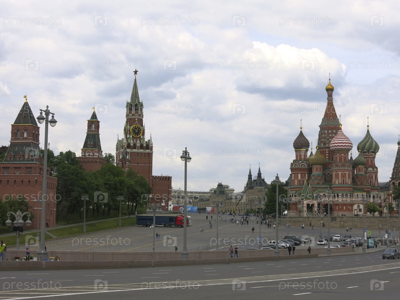 Собор Василия Блаженного и Спасская башня Московского Кремля на Красной площади в Москве