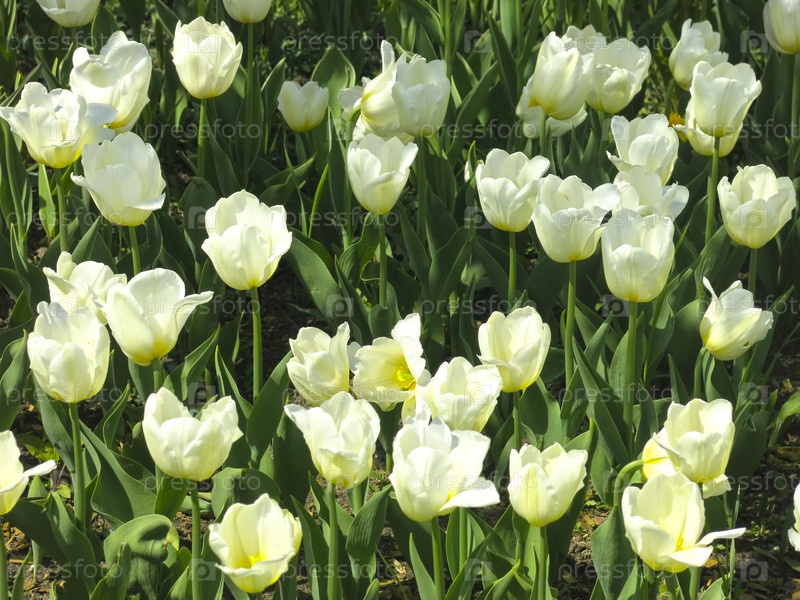 Весной на клумбе распускаются белые тюльпаны