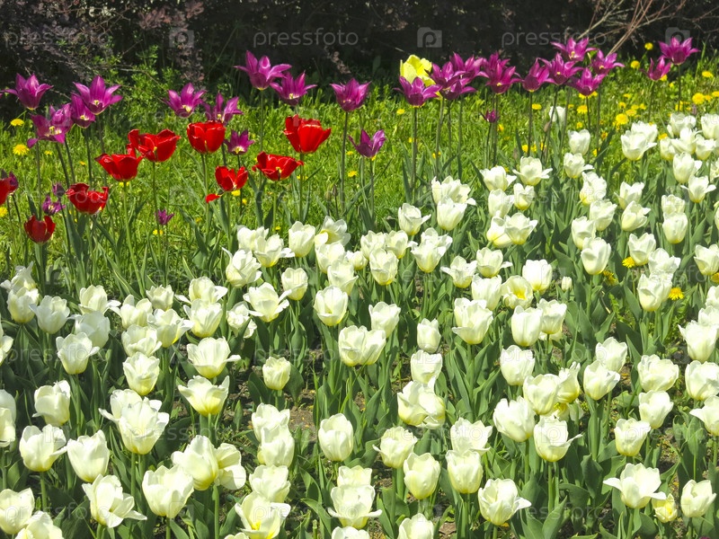 Летом на клумбе распускаются фиолетовые, красные и белые тюльпаны