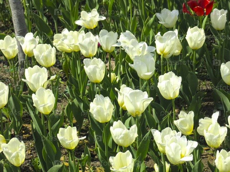 Весной на клумбе распускаются белые тюльпаны