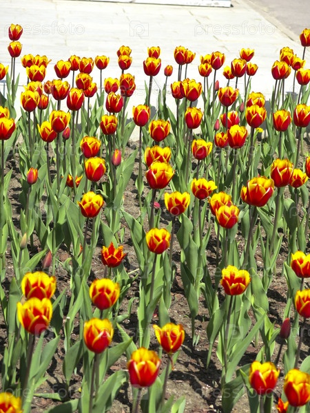 Пестрые красно-желтые тюльпаны распускаются весной на клумбе