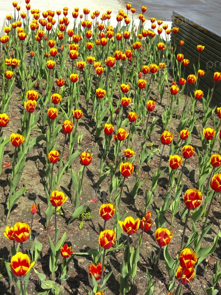 Пестрые красно-желтые тюльпаны распускаются весной на клумбе