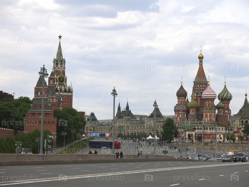 Панорама Красной площади в Москве: собор Василия Блаженного, Спасская башня Кремля, туристические автобусы
