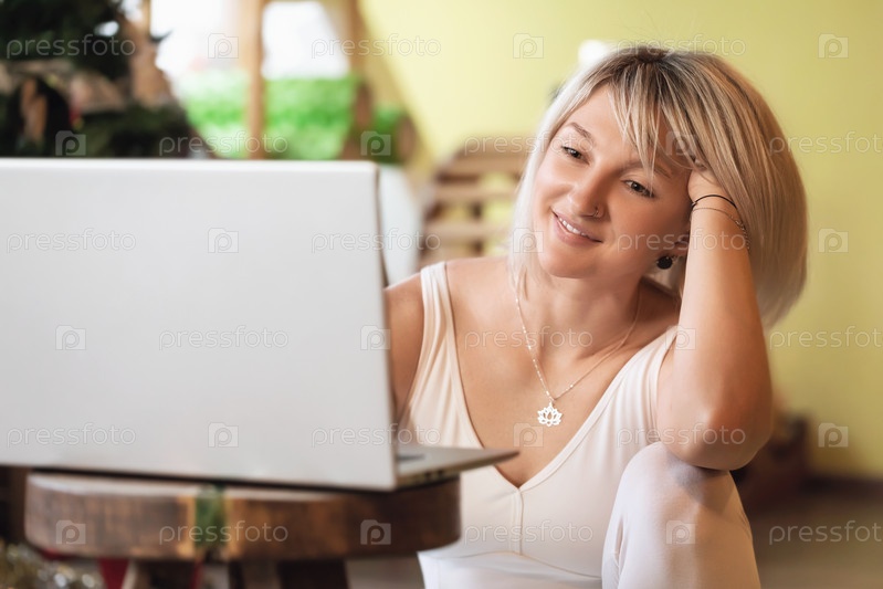 Довольная женщина в спортивной одежде общается в студии, сидя перед ноутбуком