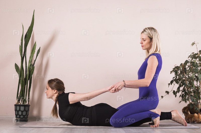 Женщина-инструктор по йоге, помогающая ученику выполнять упражнение Дханурасана или позу лука с изгибом назад, тренируется в спортивной одежде в комнате у стены