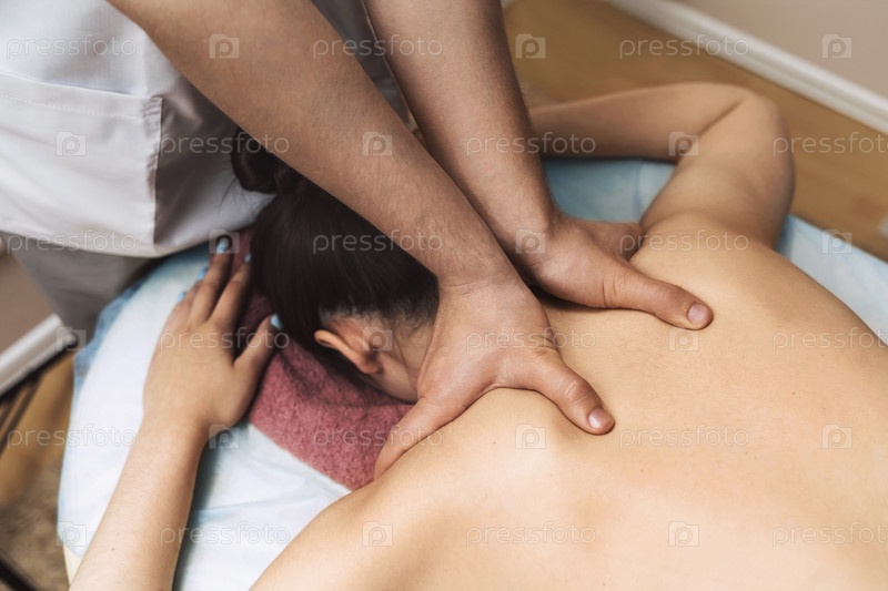 Специалист выполняет массаж клиенту в области шеи и трапециевидных мышц