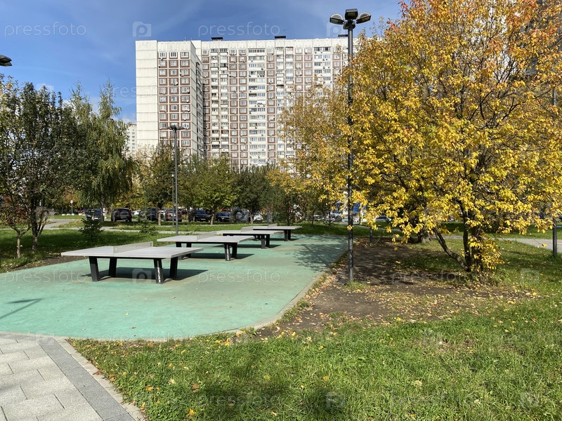 Столы для настольного тенниса в парке в сухой солнечный осенний день