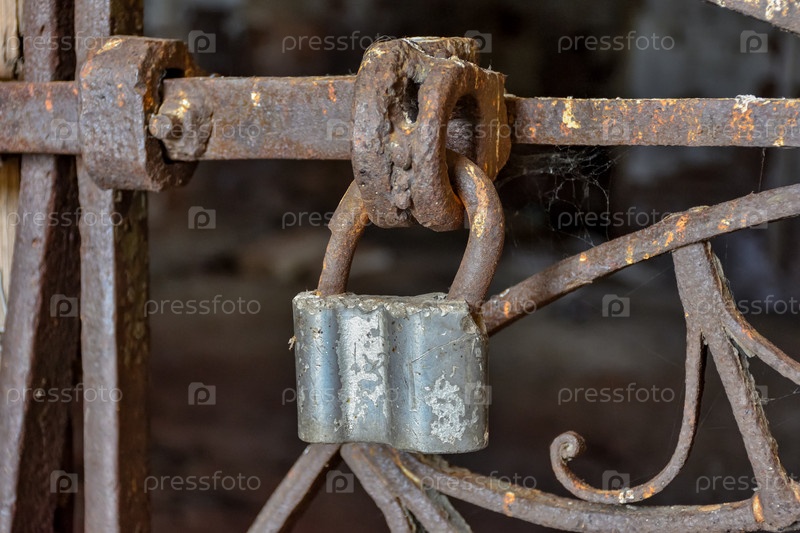 Ржавая цепь заперта на металлических воротах против заброшенного здания