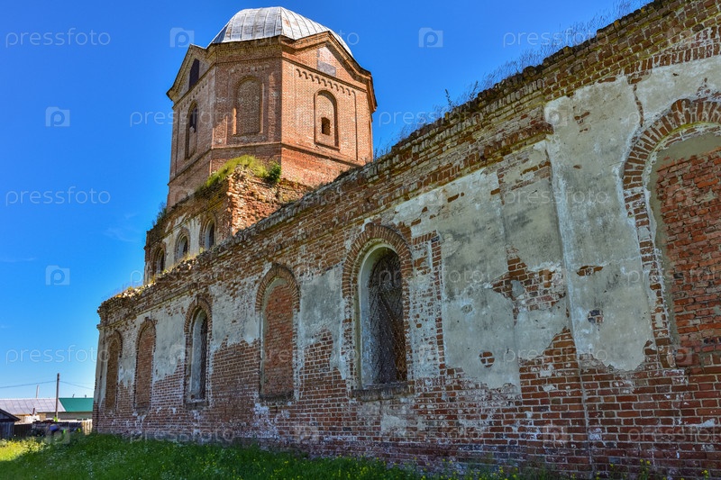 Разрушенная церковь с заросшей травой колокольней на фоне облачного неба, вид сбоку