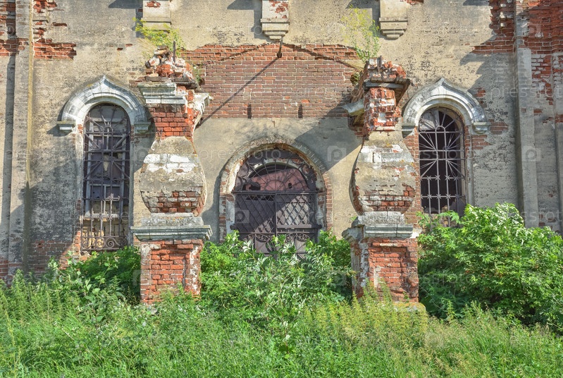 Часть разрушенной церкви с заросшей травой колокольней на фоне облачного неба, крупный план